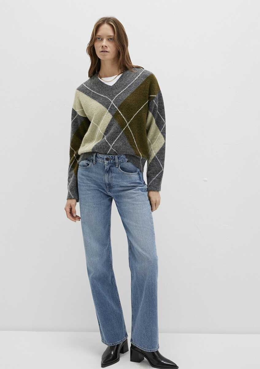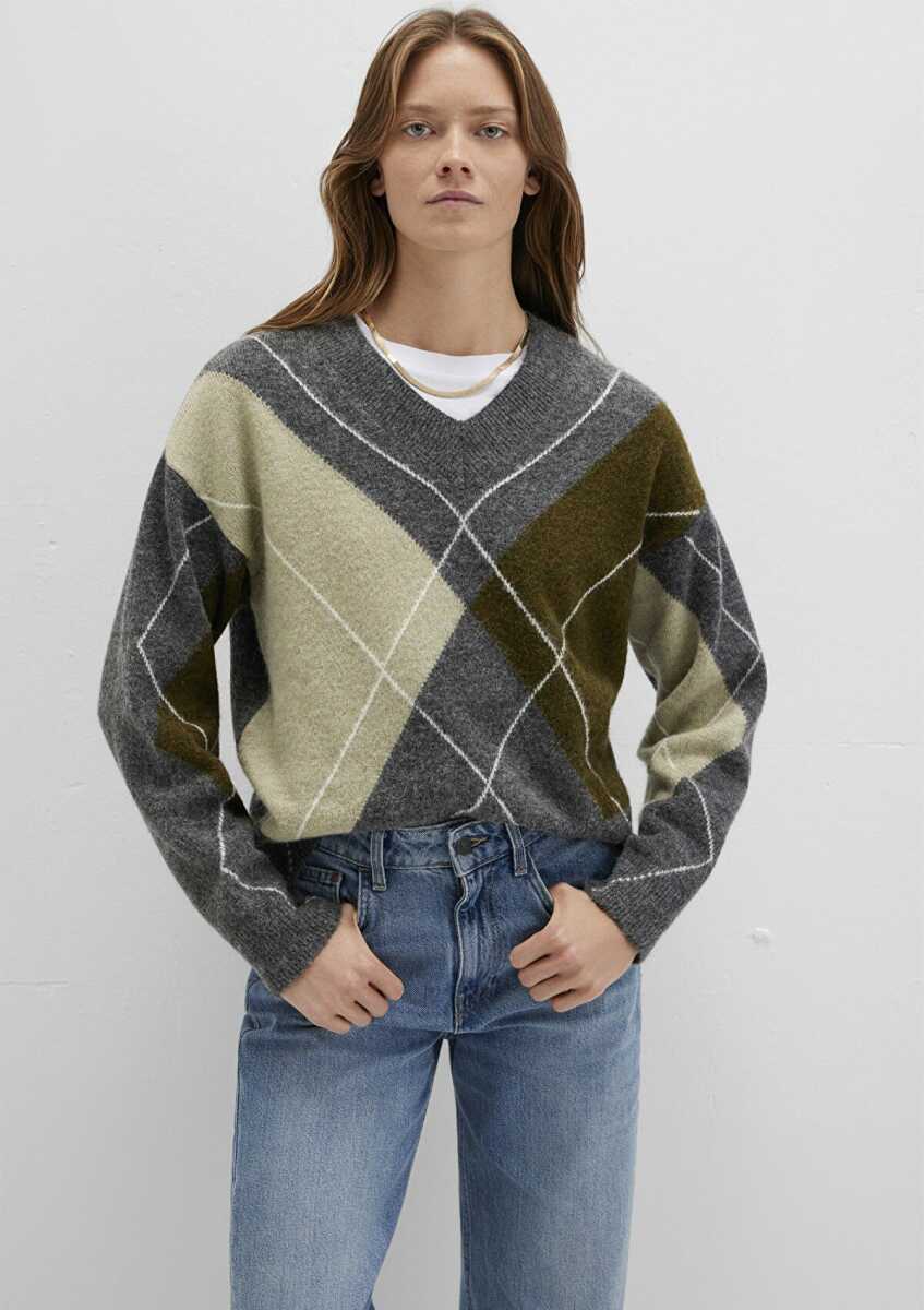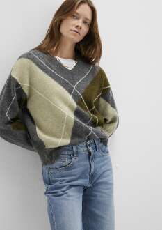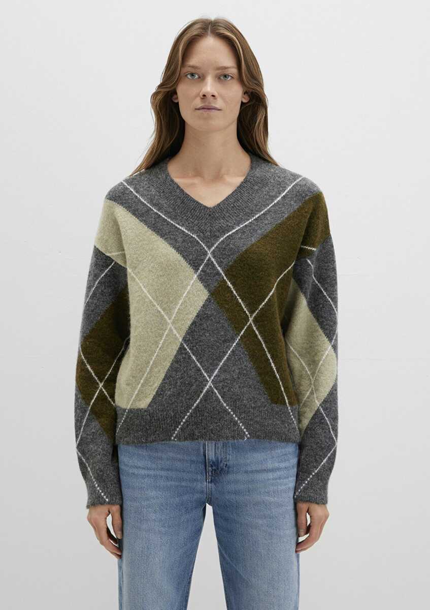 Mavi Baklava Desenli Gri Loose Fit Kadın Kazak 1710826-87829