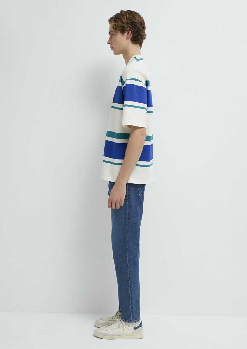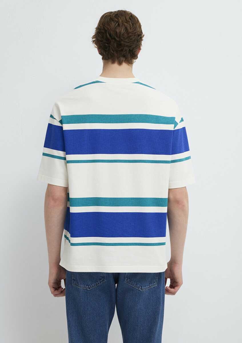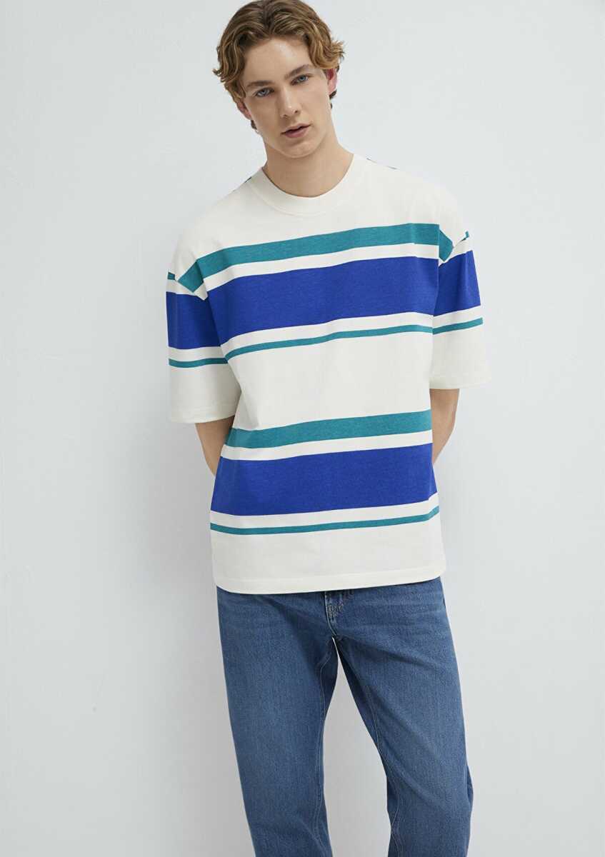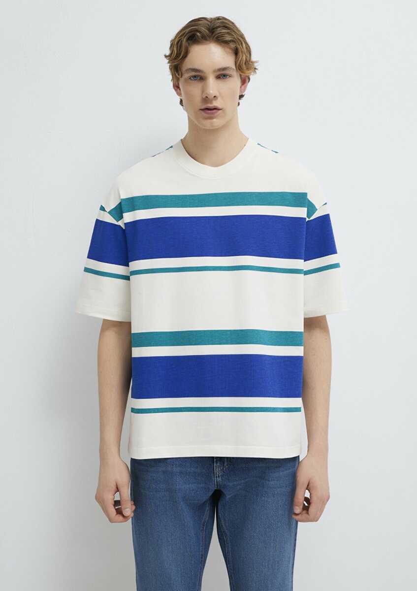 Mavi Blok Çizgili Ekru Oversize Erkek Tişört 0613331-70057