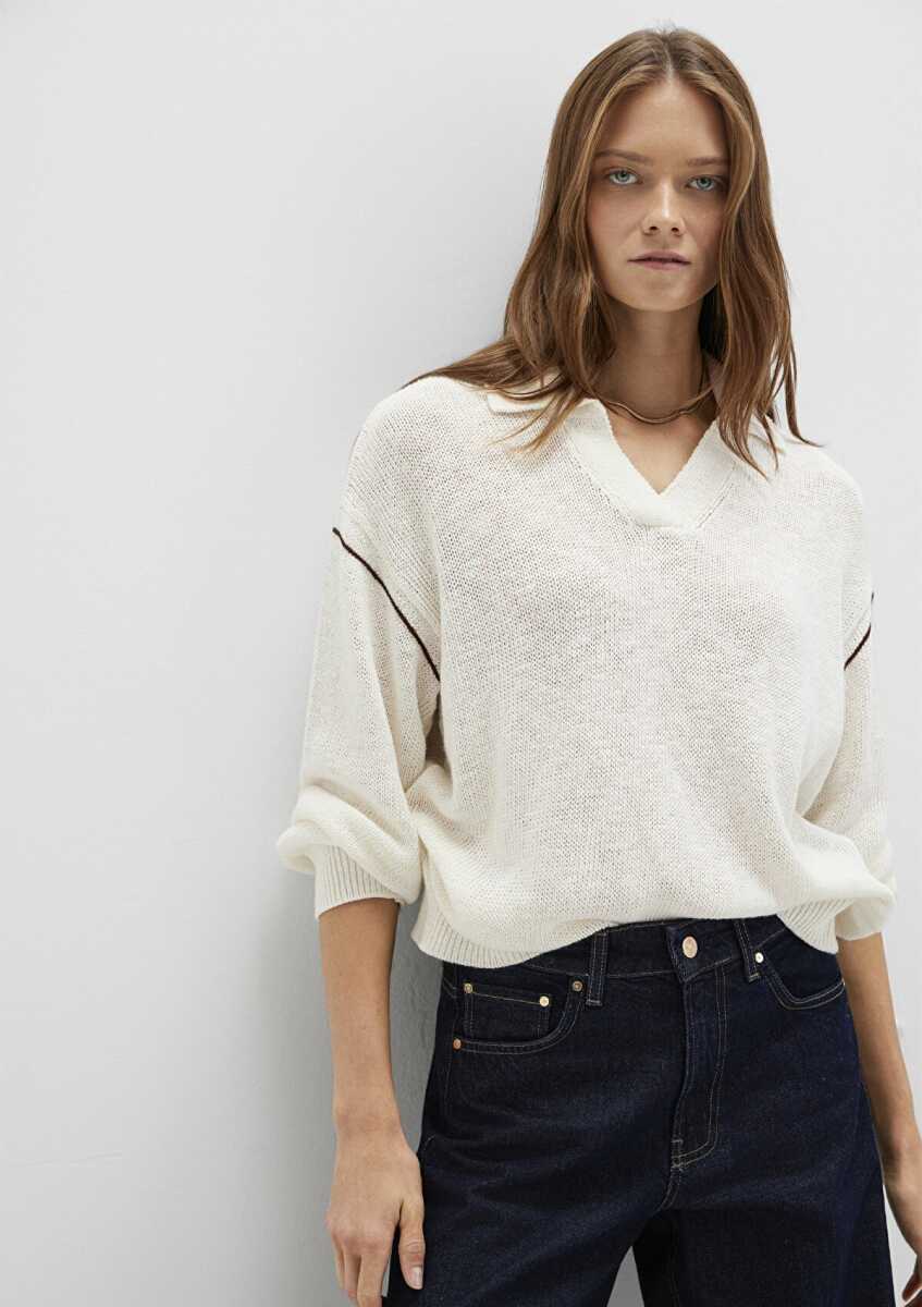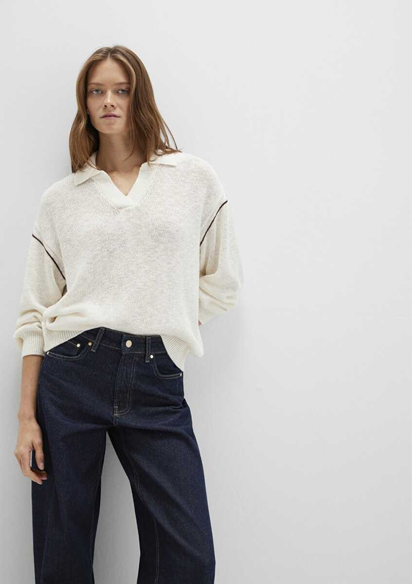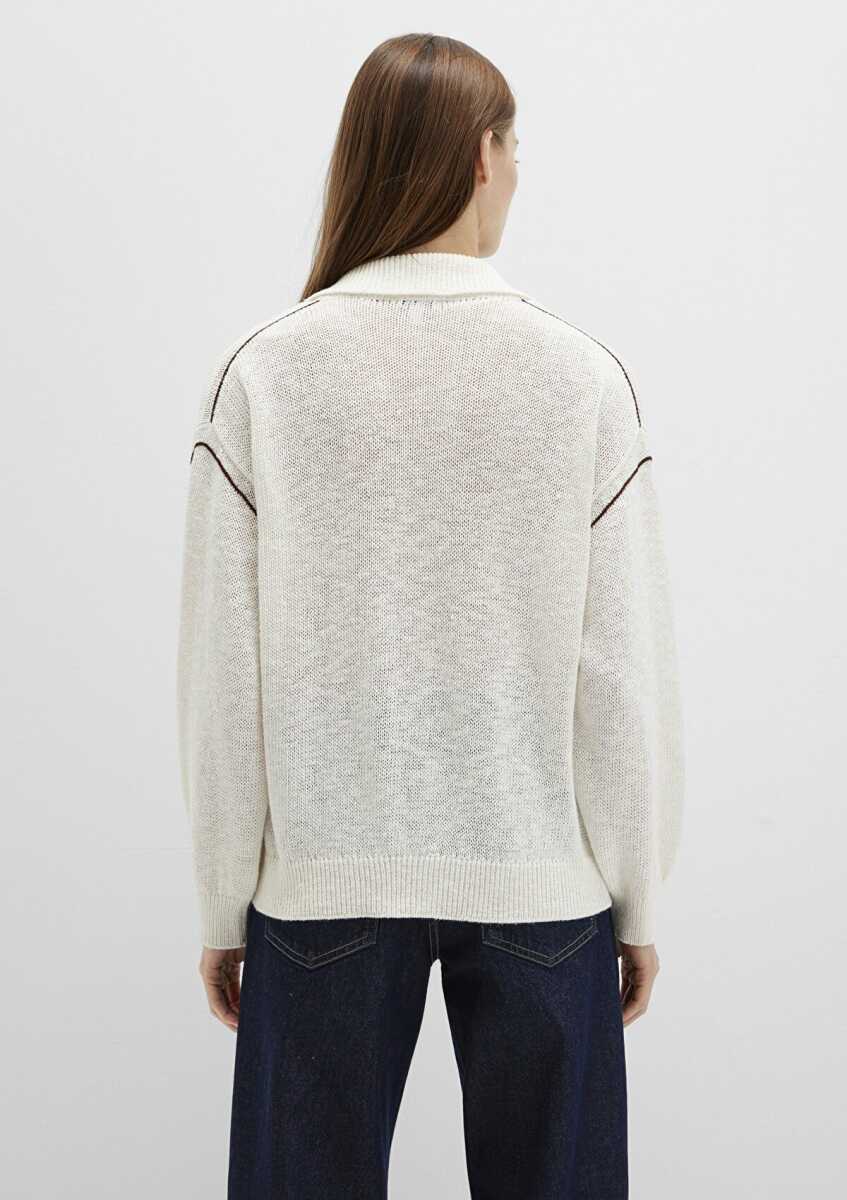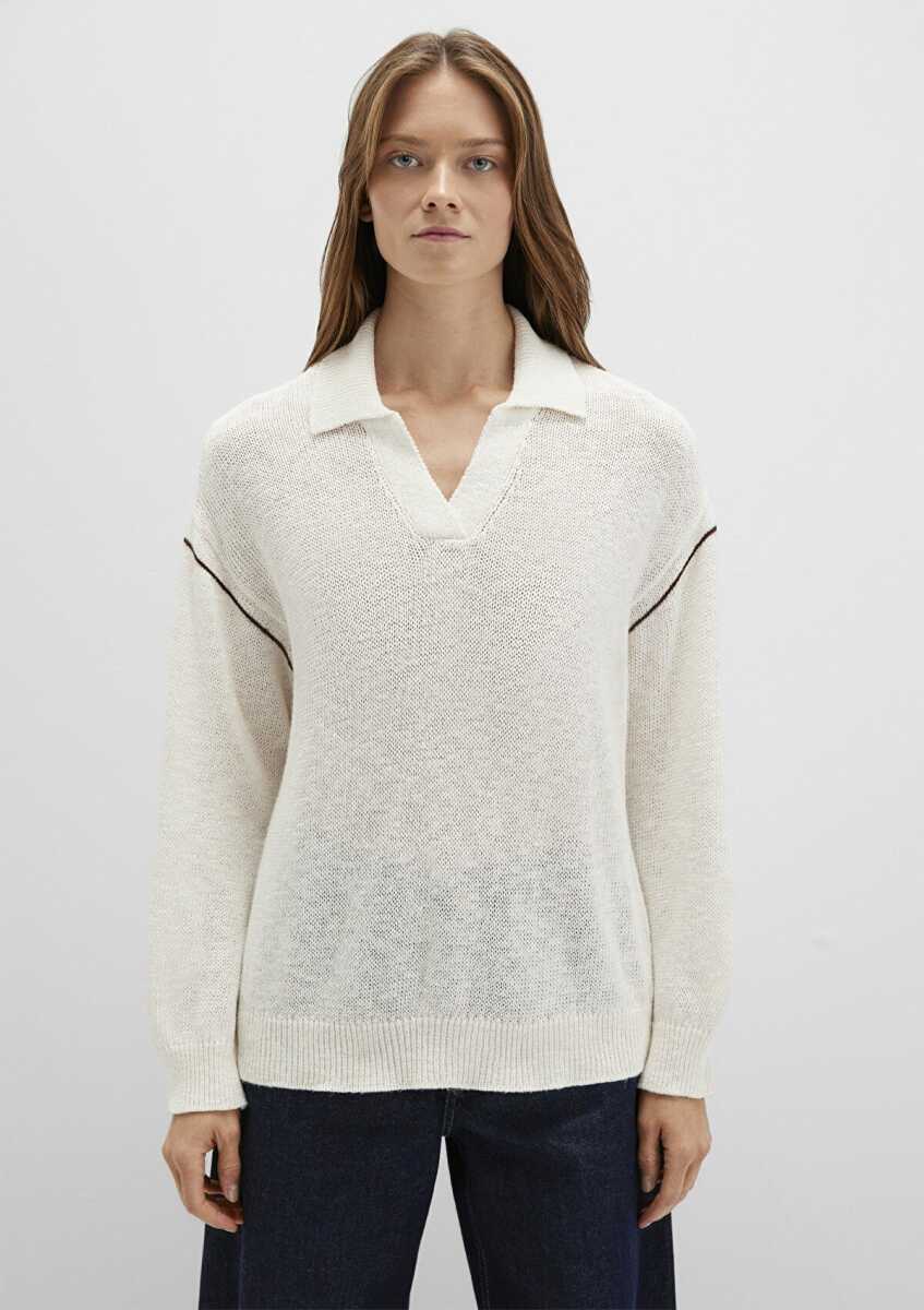 Mavi Kol Detaylı Bej Triko Oversize Polo Kadın Kazak 1710834-91338