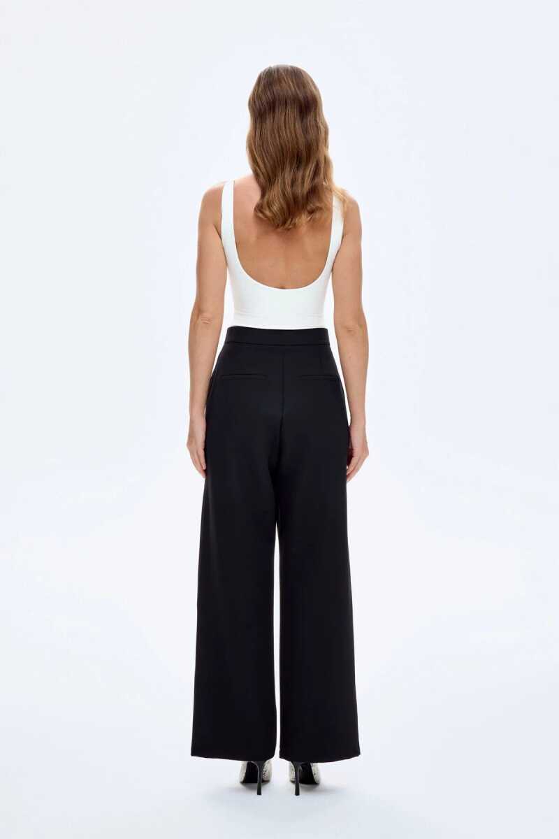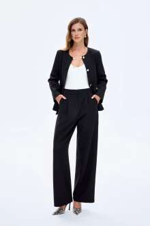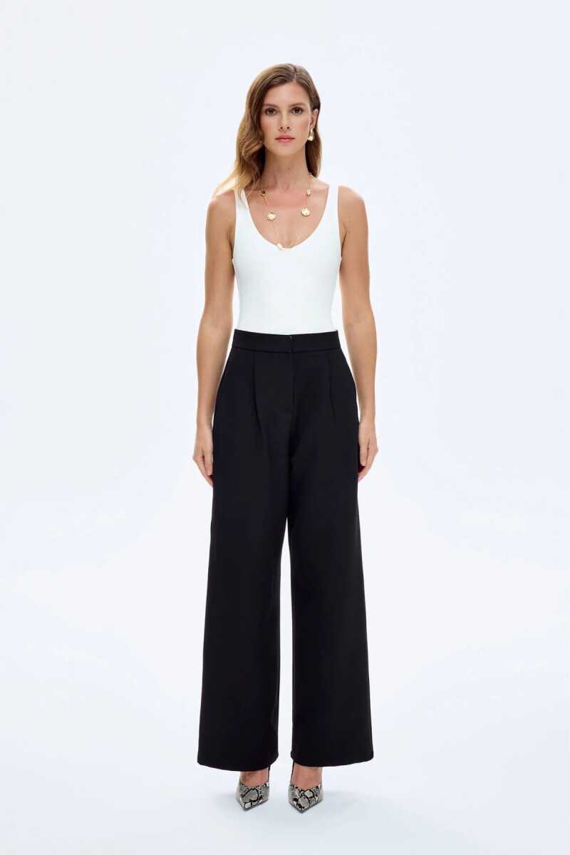 Düz kesim yüksek bel yan cepli fermuarlı ve kanca kapamalı pile detaylı uzun boy bol paça kumaş pantolon.Kumaş BilgisiElastan %5 Polyester %95ÜrünManken ÖlçüleriÜrün Boy Ölçüsü: 112 cm Bel: 35 cm Basen: 54 cm Manken Ölçüleri: Boy:1.75 Göğüs:78 Bel:60 Basen:90 Beden:S