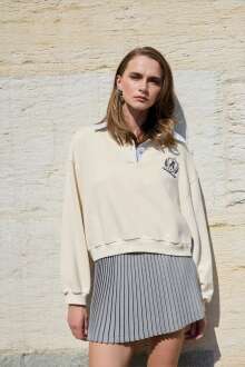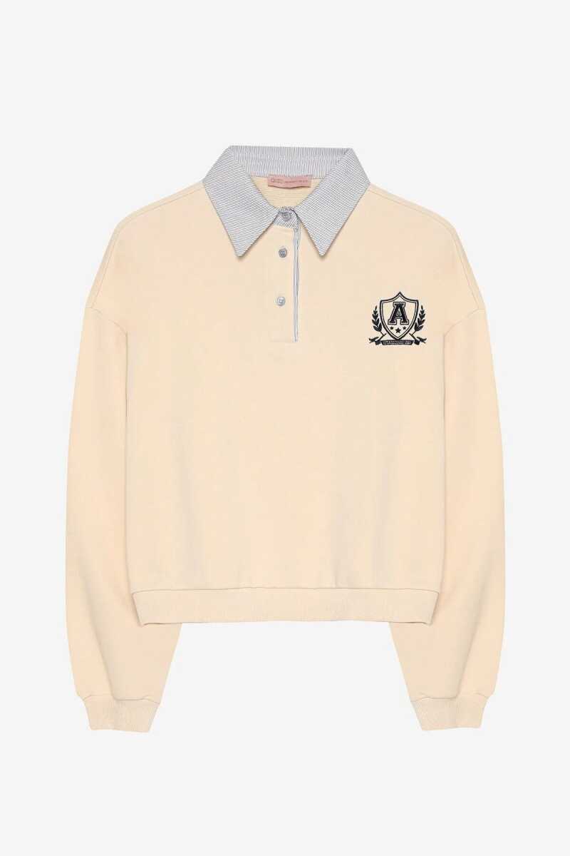 Çizgili gömlek yaka detaylı düğme kapamalı arma nakış işlemeli şardonsuz ribanalı uzun kollu oversize sweatshirt.Kumaş BilgisiPamuklu %100Yıkama TalimatlarıMakinede 30° Yıkayabilirsiniz Gerektiğinde Klorsuz Çamaşır Suyu Konabilir Kurutma Makinesinde Normal Düşük Isıda Düşük Isıda Ütüleyiniz Kuru Temizleme Az Çözücü