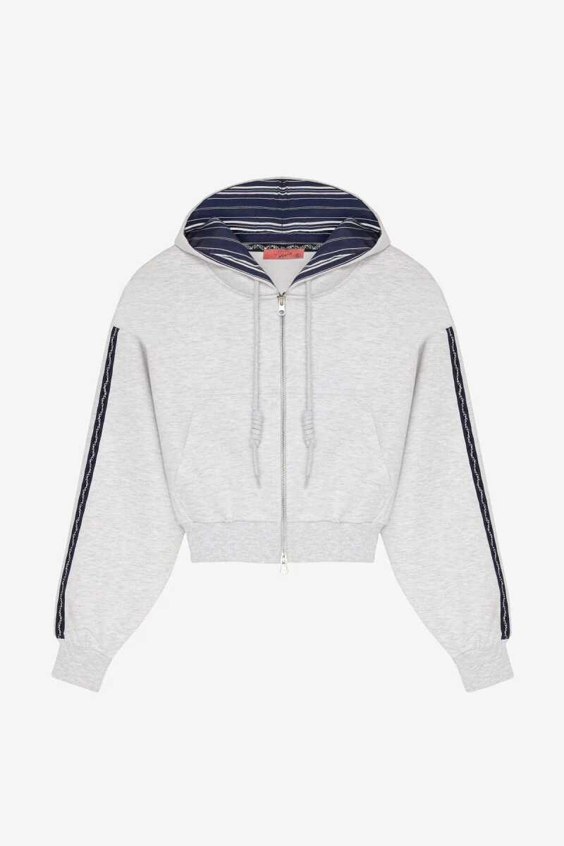 Kapüşonlu içi çizgili kumaştan kolları şerit detaylı fermuar kapamalı göğsü yazı nakış baskılı şardonsuz ip büzgü detaylı kanguru cepli uzun kollu kısa boy sweatshirt.Kumaş BilgisiPamuklu %35 Polyester %65ÜrünManken ÖlçüleriÜrün Boy Ölçüsü: 48 cm Göğüs: 55 cm Manken Ölçüleri: Boy:1.75 Göğüs:78 Bel:60 Basen:90 Beden:SYıkama TalimatlarıMakinede 30° Yıkayabilirsiniz Gerektiğinde Klorsuz Çamaşır Suyu Konabilir Kurutma Makinesinde Normal Düşük Isıda Düşük Isıda Ütüleyiniz Kuru Temizleme Az Çözücü