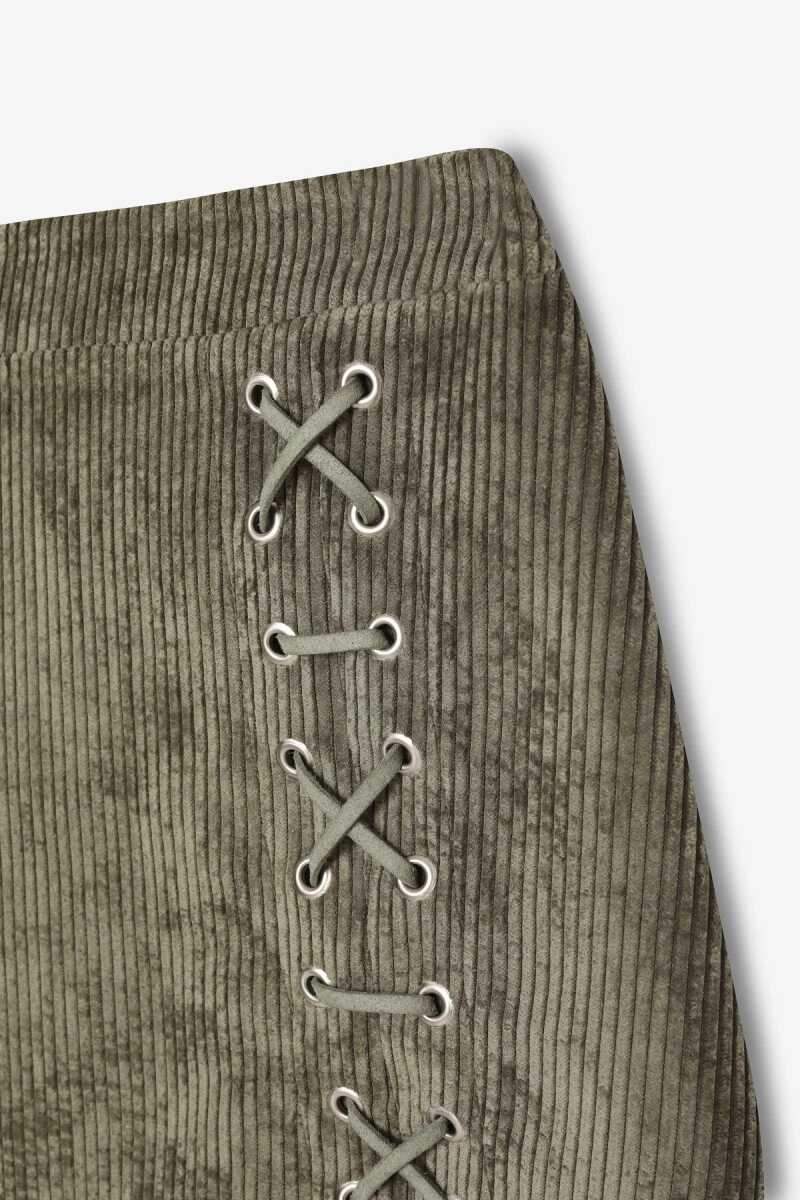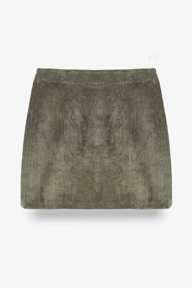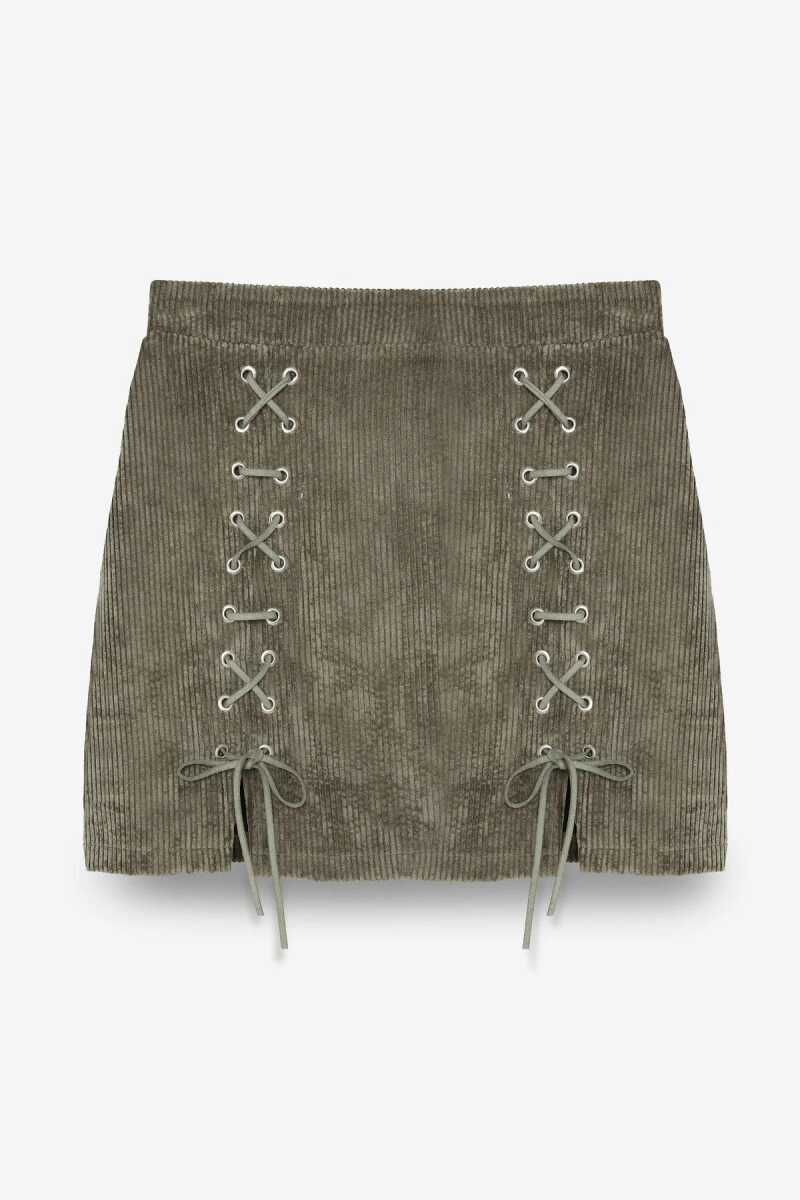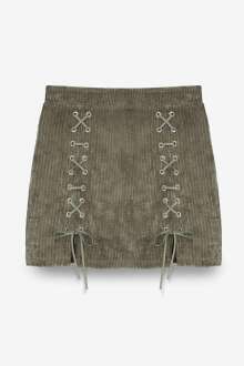 Ön kısmı metal halkalı bağcık bağlama süslemeli beli yüksek yandan fermuar kapamalı fitilli kadife kumaştan mini boy etek.Kumaş BilgisiPolyester %100