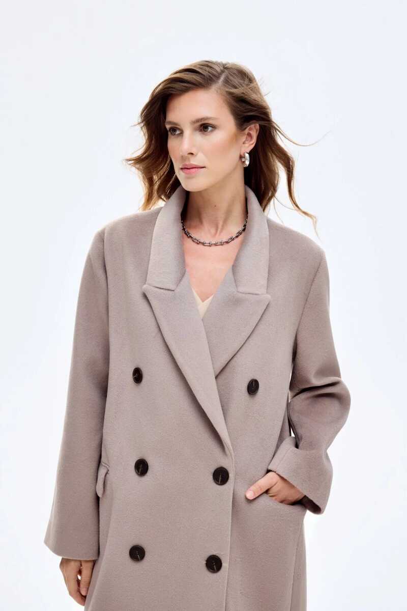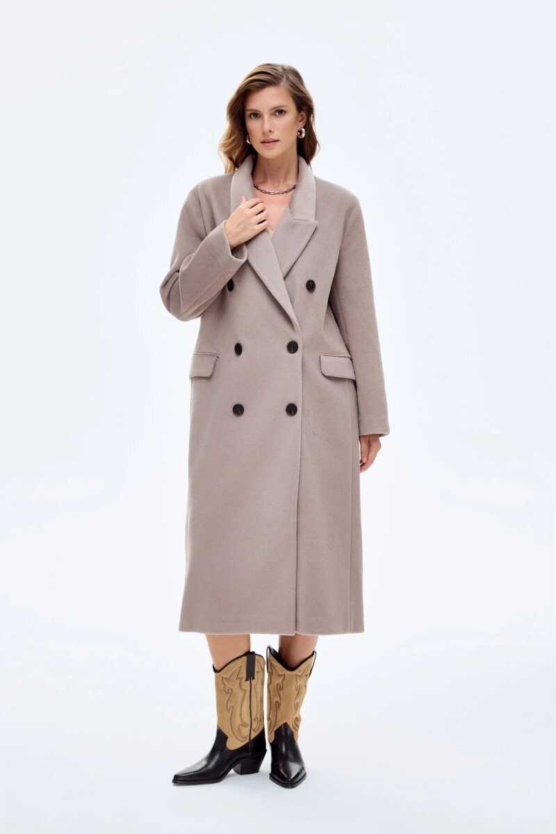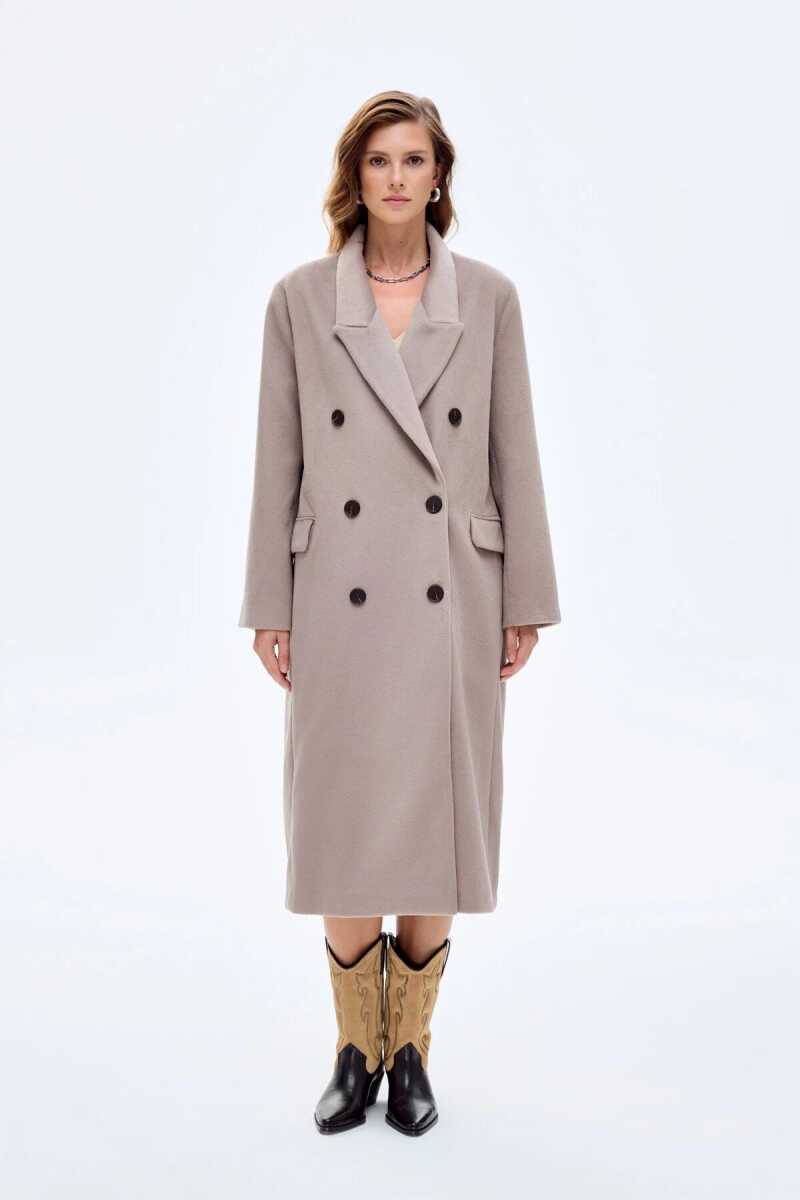 İçi kendi renginden astarlı kruvaze düğme kapamalı vatkalı omuzlu uzun kollu cep kapaklı yırtmaç detaylı uzun kaşe kaban.Kumaş BilgisiLycra %3 Polyester %97