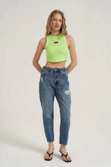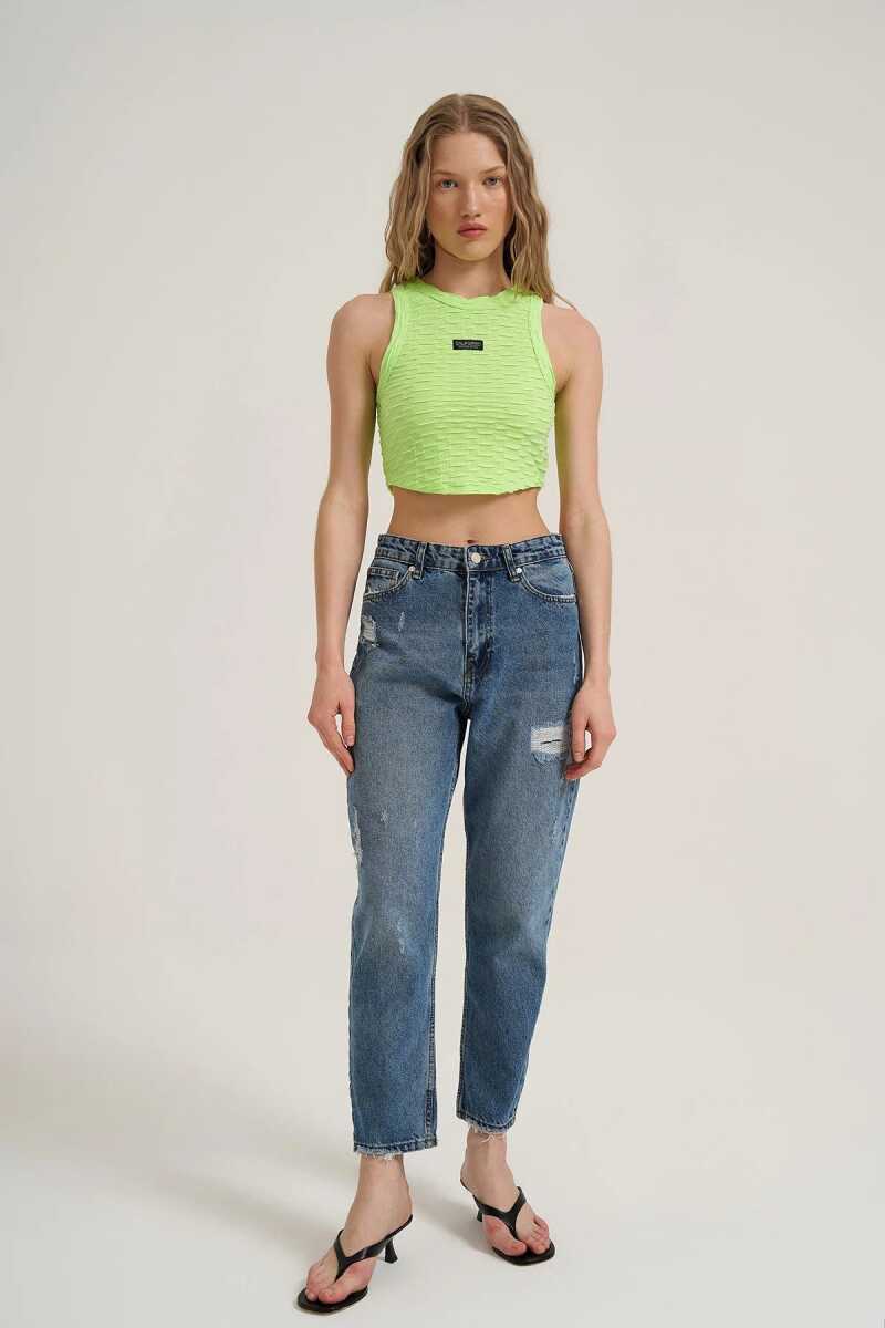 Yırtık detaylı yüksek bel denim pantolon.Kumaş BilgisiPamuklu %100ÜrünManken Ölçüleri Manken Ölçüleri: Boy:1.74 Bel:61 Göğüs:78 Basen:90 Bedeni:SYıkama TalimatlarıMakinede 30° Yıkayabilirsiniz Gerektiğinde Klorsuz Çamaşır Suyu Konabilir Kurutma Makinesinde Normal Düşük Isıda Düşük Isıda Ütüleyiniz Kuru Temizleme Az Çözücü